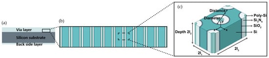 The silicon substrate used in this paper has a diameter of 150 and a thickness of 725 . As seen in Figure 2c, the vias have a diameter of 6 , a depth of 30 , and a distance of 3 between them. The layer thicknesses of SiO2, Si3N4, and poly-Si are 0.3 , 1.6 , and 0.5 , respectively.