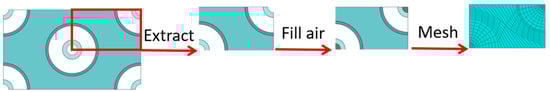 In order to facilitate the creation of constraints mentioned in Section 2.2.1 in Abaqus, the RVE is initially divided into four segments. From these segments, a 1/4 RVE model is then extracted and meshed. The void space within the RVE is filled with elastic air, which has a zero CTE and an elastic modulus that can be ignored []. Subsequently, the “radial pattern” command is employed to assemble the complete RVE model, and then the homogenization method can be applied. This process allows for easier identification of node pairs on opposite sides, making it easier to construct the constraints. A top view of the process is depicted in Figure 3.