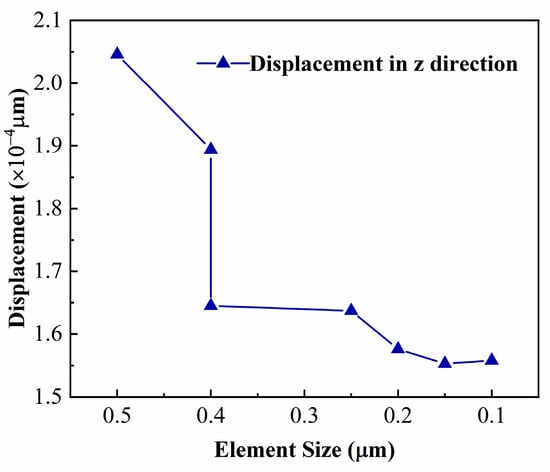 The meso-scale homogenization was preceded by a mesh convergence study, a crucial step to ensure the simulation’s accuracy and efficiency. The convergence study was conducted on a 1/4 RVE model subjected to one-dimensional tensile stress. The displacement result in the z-direction was examined to verify mesh convergence, as shown in Figure 4. Subsequently, the homogenized properties were assessed, which revealed a relative error of less than 1% when the mesh converged. The mesh size determined in this step is employed in subsequent simulations.