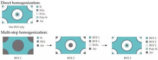 - In multi-step homogenization (homo 2), after process step 2, the RVE 2 consists of three materials: Si, SiO2, and Si3N4. At this stage, the properties of SiO2 and Si are substituted with the homogenized RVE 1 determined in the previous step. Then, after process step 3, the material properties of Si, SiO2, and Si3N4 are substituted with the homogenized properties of the RVE 2 as determined in the last step.