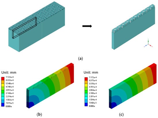 To validate the accuracy of the proposed approach, we created a numerical validation structure that had ten vias, as depicted in Figure 6a. The dimensions of the vias matched the parameters elaborated in Section 2.1, except for a via depth of 5 and a substrate thickness of 50 . The detailed model incorporated the materials listed in Table 1, while the homogenized model simplified the structure to include only Si and one homogenized material determined by the multi-step homogenization method. Identical meshing and boundary conditions were applied to the detailed and homogenized models. Both models were subjected to the same temperature variation of 1 °C. The simulation results of the homogenized model and the detailed model with the actual vias were compared. As illustrated in Figure 6b,c, the results showed insignificant differences between the deformation data of the two models, falling within a range of less than 1%. These minor differences supported the effectiveness of our method.