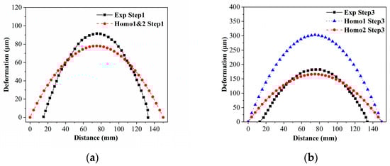 Experimental measurement of wafer warpage compared with two homogenization results (Exp: experiment results, homo 1: direct homogenization results, homo 2: multi-step homogenization results). (a) After process step 1: SiO2 layer deposition; (b) After process step 3: Poly-Si layer deposition.