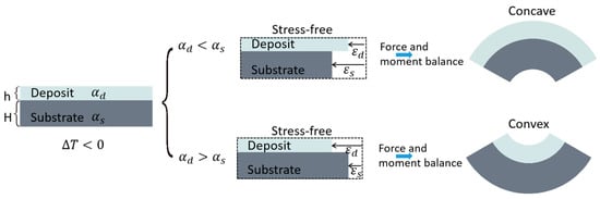 An equal biaxial stress state is generated when the material used in the layered systems has isotropic properties within the plane and negligible through-thickness stress. This state can be described by introducing strain in two arbitrary in-plane directions that are orthogonal and equivalent. To provide a simplified illustration of the relationship between the CTE difference and the warpage shape, we will focus on the one-dimensional case, which could easily be generalized to higher-dimensional cases. The CTE of the deposition layer is denoted as and that of the substrate is . When , the deposition layer will contract less during cooling (see Equation (11)), resulting in a concave wafer warpage. Conversely, when , the deposition layer will contract more than the substrate, leading to the formation of a convex wafer warpage, as depicted in Figure 8.