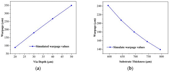 The effect of (a) via depth, (b) substrate thickness on wafer warpage.
