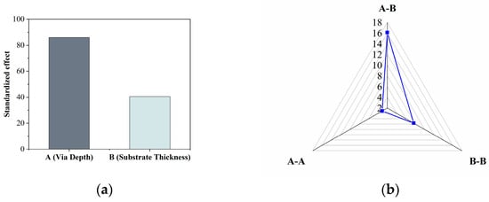 Standardized effects of (a) A: via depth and B: substrate thickness, (b) coupling factors A–A, A–B, and B–B.