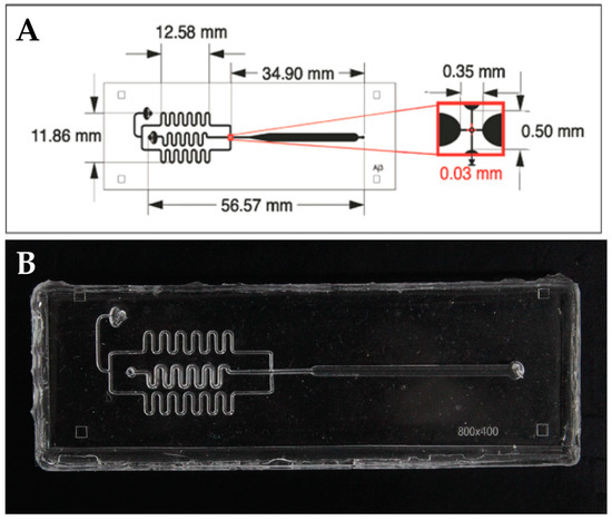 Microfluidic device was designed for (Layout design editor software). The PDMS microdevices (Sylgard 184, Dow Corning Marietta, Georgia, USA,) were manufactured as described previously [26]; in the case of the forming device of droplets. Briefly, a mold in high relief with the desired design was made by photolithography in a 700 µm thick silicon wafer (Virginia Semiconductor, Inc., Fredericksburg, VA, USA) using the negative resin SU-8 (MicroChem, Newton, MA, USA). The microchannels have a final height of 150 µm. Next, the mold was placed under vacuum with trichloro (1H, 1H, 2H, 2H-perfluoro-octyl) silane (Sigma, St. Louis, MO, USA) for 1 h to protect the SU-8 resin from detachment by releasing PDMS from the mold. The PDMS was mixed with the curing agent in a 10:1 ratio, and the mixture was placed under vacuum for 1 h to remove air bubbles. Then, the mixture was poured back under vacuum for 1 h and cured in an oven at 70 °C for 70 min. The PDMS was not molded, and the fluidic connection ports were constructed by drilling holes in the PDMS with a syringe needle (21-gauge, internal diameter of 0.51 mm). Finally, the PDMS was assembled with the glass base. Through the plasma oxygen system (deposition of chemical vapors enhanced with plasma), the device and the glass base are exposed for 3 min at a pressure of more than 4000 g overnight [18,19,20]. In the case of a droplet storage chip, multilevel photopolymer technology and microdevice manufacturing technology were used, as described in previous work [25,26,27].