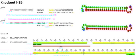 For this study, a couple of guides were designed with the help of the online benchling/CRISPR tool, where the ones with the highest percentage of in silico effectiveness were chosen to knock out the mCerulean–H2B protein. In addition, primers flanking the region of interest were designed to subsequently verify their effectiveness in inhibiting the fluorescent protein (Figure 2).