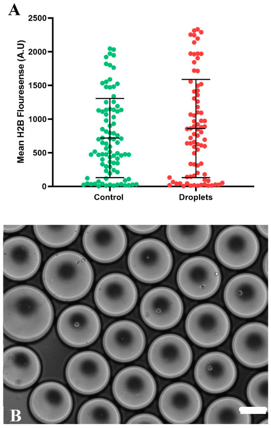 (A) Shows the comparison of the knockout of the H2B–mCerulean protein by the CRISPR-Cas9 method in droplets (red) and culture dish (green). A total of 246 individual cells were analyzed, including both the control group and the droplets, with a standard deviation of 4.16644. (B) Representative images of cells that were edited by the CRISPR-Cas9 method within droplets. Scale bar corresponds to 200 μm.