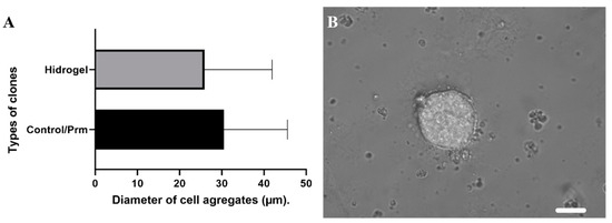 Cell aggregates. (A) Shows the comparison of the growth of the hydrogels vs. the colonies selected by the conventional method. (B) Representative image of hydrogel cell aggregates at 72 h after seeding. Scale bar is 200 µm.