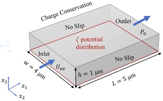 Based on the theory above, we can make a reasonable prediction that in the steady-state flow field, such as pressure-driven flow, there may be a non-uniform two-dimensional ζ potential distribution at the solid–liquid interface, which will induce the generation of local electrostatic charge and EVF, resulting in a swirling flow near the interface. To validate this conjecture, we established a mathematical model of non-uniform ζ potential distribution and proceeded with a numerical simulation by Comsol Multiphysics on Equations (1)–(5). The influence of non-uniform ζ potential distribution at the solid–liquid interface on the flow is investigated under steady-state approximation with the value of relative tolerance is .
