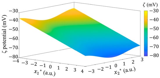 As mentioned above, in order to investigate the effect of non-uniform ζ potential distribution on interfacial flow, a mathematical model of ζ potential distribution (as plotted in Figure 2) was established to characterize the ζ potential distribution in the solid–liquid interface at the bottom of the microchannel only (as shown in Figure 1) based on the recent report of Meng et al. [], as
