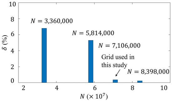 To ensure computational validity and stability, we conducted a grid independence analysis by systematically varying the grid size in all dimensions while keeping other parameters such as boundary conditions and solvers unchanged. The relative errors () of the simulated velocity field between the models of different grid quantities () are plotted in Figure 4. It can be seen that decreases asymptotically towards zero, with the increase in grid quantity. The minimum value is 0.24%. The results show that when the grid quantity is equal to or beyond , is within 1%, indicating a negligible dependency of computational results on grid density []. Consequently, to strike a balance between computational efficiency and precision, we adopted a grid resolution of for subsequent analyses in this study.