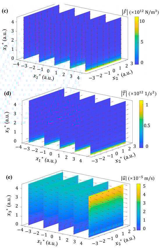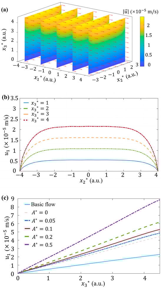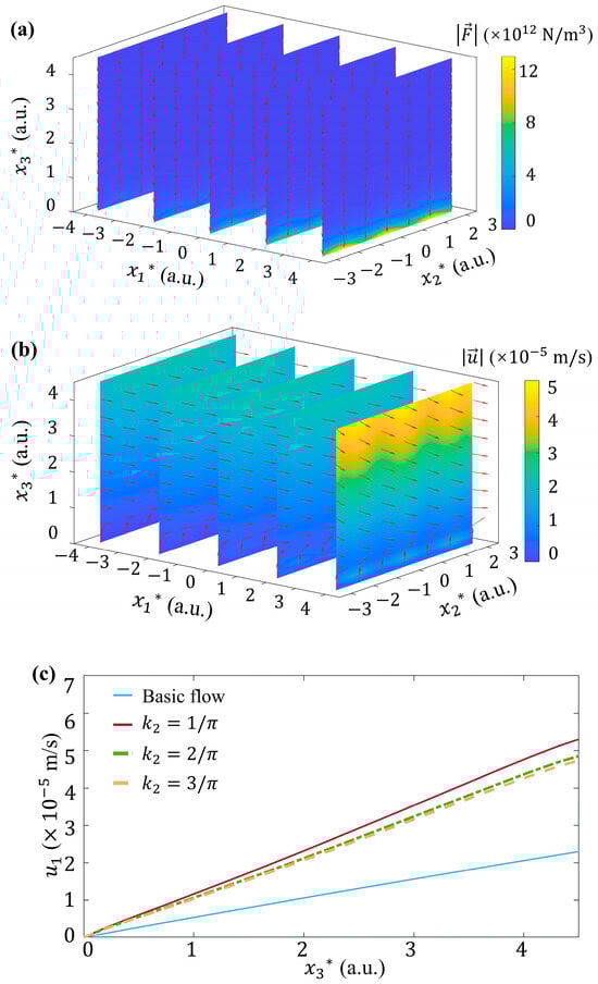 In this case, the velocity field distribution of the basic flow is shown in Figure 5a, where , , with characteristic length μm and Debye length nm. We applied a small volume rate (), where the basic flow velocity is m/s at 0.5 µm from the wall, to simulate a relatively large wall strain rate (240 s−1). Slice and quiver diagrams are used to show the distribution of the intensity (where the magnitude of intensity is represented by the color) and direction of the fluid velocity in the - planes at different streamwise positions. The direction of the fluid velocity after normalization at each position is represented by the vector arrow. Due to the absence of the external force, the velocity of the basic flow shows an approximately parabolic distribution in the spanwise direction near the wall, as can be found in Figure 5b with .