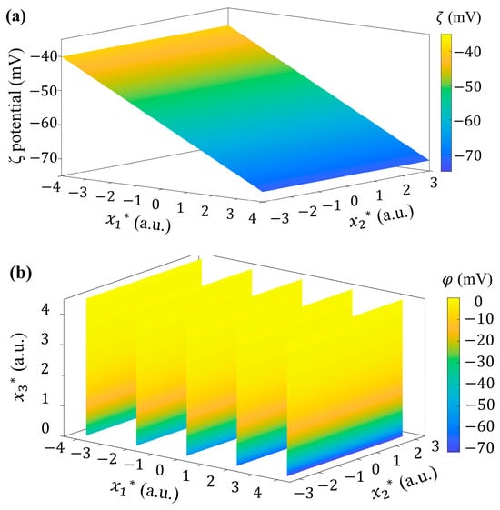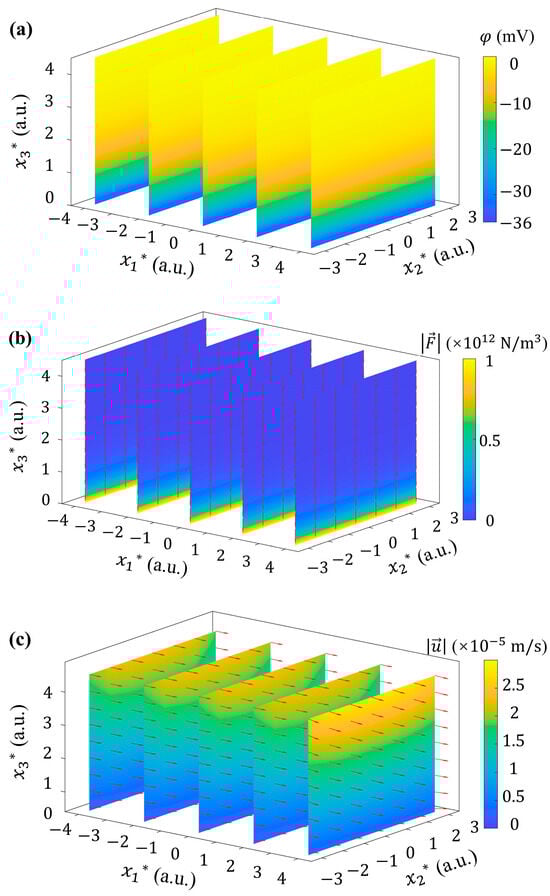By substituting Equation (14) into Equation (5), electroosmotic potential could be calculated. In turn, the electric charge density , electric field strength , EVF, and could be calculated accordingly by Equations (3), (4), (11) and (12).