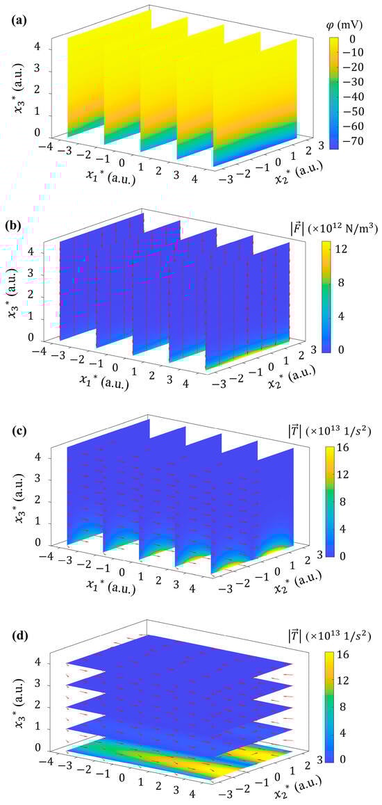 Potential, and generated by 2D ζ potential with 1/m, , mV and . (a) 3D distribution of . (b) 3D distribution of electric volume force . (c,d) 3D distribution of .