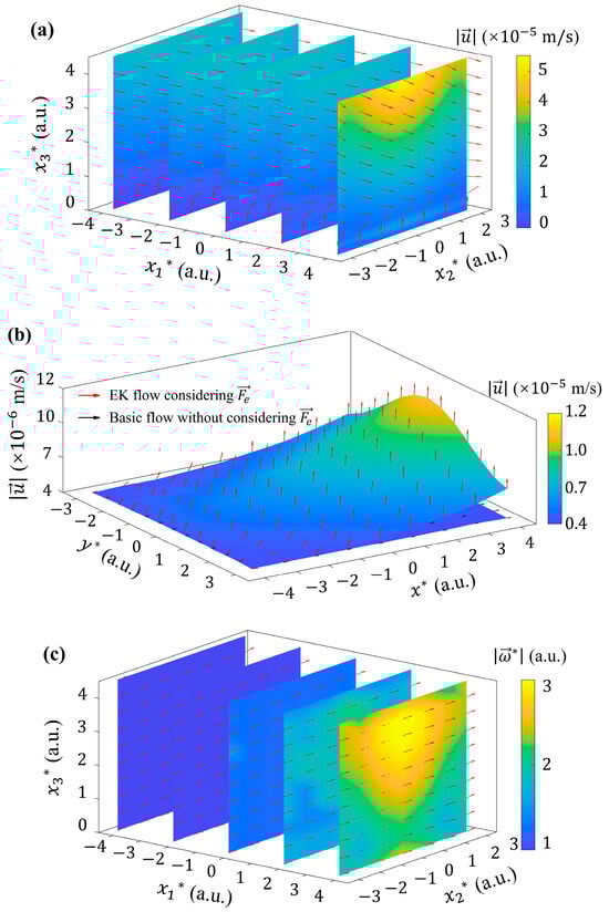 Velocity and vorticity fields generated by 2D ζ potential with 1/m, , mV and . (a) 3D distribution of fluid velocity . (b) 2D velocity distribution of flow considering and without considering ζ potential distribution at . (c) 3D distribution of the curl of fluid velocity , denoted by , with . Here, is the maximum of basic flow.