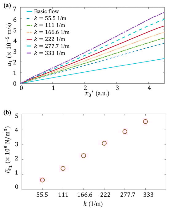 Influence of on the flow, with 1/m, , and mV. 3D distribution of (a) electric volume force and (b) fluid velocity with wavenumber . (c) Plot of streamwise velocity component, , versus dimensional height at different , where and .