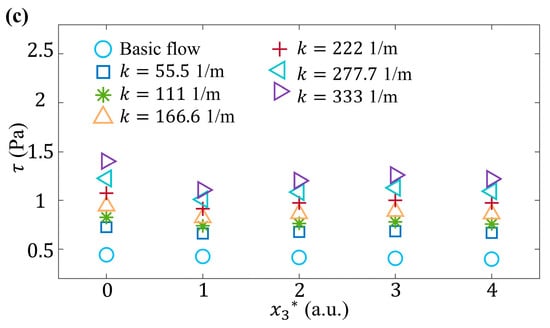 All in all, it can be seen, when taking the influence of 2D ζ potential into account, the wall shear stress can be significantly enhanced. For example, at 1/m, , mV, and , the maximum can be up to Pa, which is about 2.5 folds larger than the basic flow. A stronger wall shear stress indicates a stronger interaction between wall and flow. This could be important in many shear-sensitive circumstances, especially on biological materials. One example is that the flow shear stress on cells and tissues may be larger than previously expected. Studying the different control parameters of 2D potential distribution can help us better understand the effect of charge distribution on interfacial flow, and according to Equation (16), we can even realize of adjustment of wall shear stress by changing these parameters.