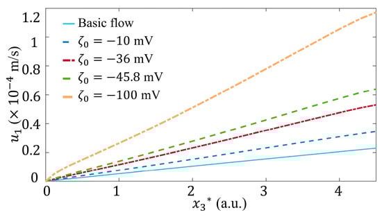 The influence of is investigated at 1/m, mV and , as shown in Figure 5c. The comparison between the basic flow and the flow under 1D ζ potential (i.e., ) shows that the fluid velocity can be enhanced even if . When spanwise variation of ζ is taken into account, both and velocity gradient are strengthened at larger , indicating stronger wall shear stress as well.