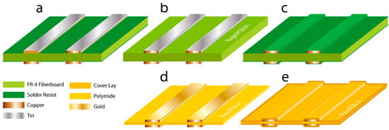 (v) Flexible PCB with copper tracks covered with Kapton coverlay (Figure 1e). After etching the copper tracks, a polyimide layer fitted with a pressure-sensitive adhesive, typically Kapton (DuPont, Wilmington, DE, USA), is applied to certain areas, which operate as solder resist layer. This layer, called a coverlay, smooths out the track geometry.