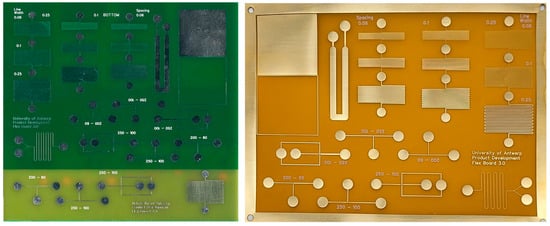 Ordering from large-scale PCB manufacturing companies results in higher accuracy, consistency, and reproducibility compared to in-house PCB prototyping. These manufacturers have enjoyed a huge boom in popularity, making it faster and cheaper to produce small quantities of prototype PCBs and flexible PCBs []. Advertised prices are often less than USD5 for bespoke boards. When ordering, many options are available. Choosing non-standard options increases the price and lead time. An overview of standard manufacturing options for rigid and flexible PCBs is shown in Table S2. In Figure 2 (PCBWay, Shenzhen, China), images of the manufactured rigid and flexible benchmark PCB are shown. Several PCBs were ordered from PCBWay.com at a price of USD 0.49 per double-sided FR-4 board for 10 pieces, which had an area of 100 × 100 mm. Flexible PCBs were ordered at a price of USD 8.78 per one-sided board for 12 pieces with an area of 75 × 100 mm. A detailed cost comparison is provided later in this publication.