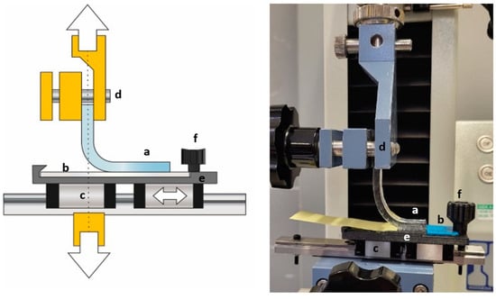 The preparation of the 10 mm wide test samples is described in full detail in the supplement in Figure S5. The samples are mounted on a custom 3D-printed fixture to hold them in a universal testing machine to perform the peel testing (Figure 3) (MTC 100, IDM Test, Donostia-San Sebastian, Gipuzkoa, Spain).