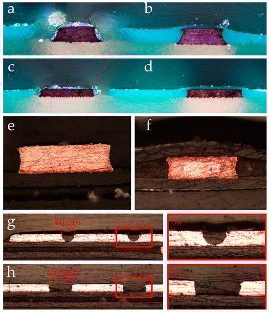 The cross-sectional shape of the tracks on the flexible PCB is more rectangular in shape compared to the FR-4 PCB. However, it still exhibits similar concave shaping of the side walls due to the isotropic wet etching that is used during production. The gold plating forms an almost negligible thin layer of around 3 µm which is significantly thinner compared to the tinning added to the FR-4 PCB. In Figure 4e,f, the cross section shows the difference between the covered and non-covered flexible PCB.