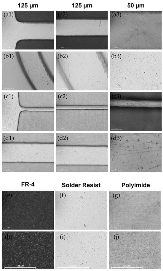 The bottom section of Figure 5e–j reveals a 2 × 3 matrix that highlights the FR-4 (Figure 5e,h), solder resist (Figure 5f,i), and polyimide (PI) (Figure 5g,j) surfaces. This arrangement transitions from base surface images to a 3× digital zoom perspective, offering insight into the subtle differences in roughness and texture across various materials and processing methods.