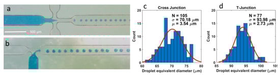 The droplet generator made by the replication of the 1oz flexible PCB showed accurate, well-defined features, with a junction that narrows down to a size of 75 µm with a channel height of 35 µm (Figure 5a,b). Using the open-source image processing software package Fuji/ImageJ (Release 2.15.1) [], the size distribution of a series of droplets was measured from a video of the droplet generator. The droplets were fitted as ellipses, and the equivalent droplet diameter was extracted as the mean of the lengths of the major and minor axes of the ellipse. For the cross-junction droplet generator shown in Figure 6a, 108 droplets were analyzed. This is shown in Figure 6c,d with a histogram binned with 1 µm width increments (shown in blue). Additionally, a normal distribution was fitted to these data (shown in red), revealing a mean equivalent droplet diameter of 70.18 µm and a standard deviation of 3.54 µm, keeping in mind the width of the channel was 250 µm, and the width of the narrowing in the cross-junction was 75 µm. Similar analyses on 77 droplets from the T-junction, as shown in Figure 6b, revealed a mean equivalent droplet diameter of 93.98 µm and a standard deviation of 2.73 µm. Again, the junction geometry had a channel width of 250 µm, and the width of the narrowing in the T-junction was 75 µm, with a channel height of 35 µm.