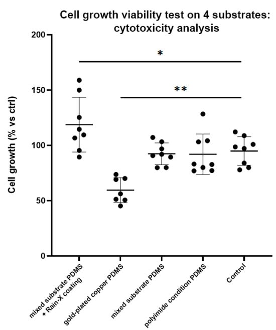 The observed increase in surface compatibility in Rain-X-coated PDMS may be attributed to its hydrophobic surface properties or its protective effects against factors that could hinder cellular compatibility. However, it is noteworthy that the slower growth seen on the copper/gold substrate is a consequence of an extended incubation period (7 days), which corresponds to a daily reduction in growth rate of approximately 8–9% compared to the control group. For many microfluidic applications, such as mixing or transport, short contact periods are typical, leading to minimal interference. Furthermore, Rain-X treatment has been proven to significantly enhance the surface quality of microfluidic chips, as demonstrated by Karade V. [], while also establishing a biocompatible protective barrier against potential PDMS leachates.