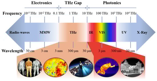 Electromagnetic waves span a broad spectrum, encompassing gamma rays to radio waves, with each segment holding immense value for humanity. Photodetectors serve as a pivotal tool in converting the optical signals of electromagnetic waves into electrical signals, unlocking a plethora of information and finding crucial applications across various modern domains [,,,,]. For instance, photodetectors operating in the ultraviolet (UV) spectrum are being widely used in industry and medicine [,]. The detection of visible light (VIS) forms the bedrock of contemporary digital camera technology []. Within the electromagnetic spectrum, the adjacent bands of infrared (IR) and terahertz (THz) occupy significant positions. As shown in Figure 1, IR and THz detectors play indispensable roles in major fields [,]. Infrared photoelectric detectors are well known to the public due to the wide application of infrared thermometers. In addition to its medical value, infrared detection technology has wide and deep applications in military and civilian fields such as reconnaissance, night vision, security, and environmental monitoring [,,]. Extending to the terahertz region, terahertz light (0.1–10 THz) has significant value in security and nondestructive testing applications due to its low photon energy. The distinctive advantages of terahertz spectroscopy in characterizing absorption make it particularly suitable for the study of large biomolecules, and it could be applied to achieve super-resolution biomedical imaging. Furthermore, terahertz photodetectors are pivotal in high-speed communications and astronomical remote sensing [,,,]. Particularly, the terahertz band is a unique frequency band for detecting the early cold universe, the dark universe, and the environment of life in the universe [].