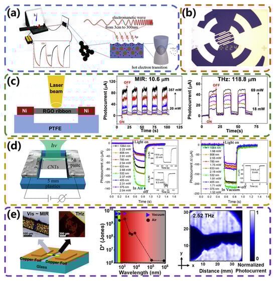 The broadband photoresponse achieved by PBE-type photodetectors is due to the ultra-broad light-absorbing ability of the sensing material. The material absorbs a broad spectrum of light while having an extremely high thermal conductivity that quickly converts the absorbed energy into uniform heat. Researchers have generally enhanced the photoresponse of such detectors by exploring novel broadband-effect materials and building specific microstructures. Photodetectors based on carbon materials are of great value in realizing the function of ultra-broad detection because of their unique electronic structure and chemical bonding properties, which are characterized by high absorbance. Ji et al. [] found a negative TCR of about 0.13–0.15%/K in superblack carbon aerogel (CA). They fabricated devices using CA films with a thickness of approximately 400 nm, which exhibited an ultra-broadband response from the UV, visible, and infrared to microwave ranges (300 nm to 3 cm). As shown in Figure 3a, with increasing temperature, electrons first flow out of the energy band of carbon quantum dots and then inject into the conduction band of graphite, which increases the carrier concentration. Owing to the hot-electron effect, the photothermal conversion and the resulting electromagnetic wave response are broadened greatly. This study showed that a broadband optical response can be realized by combining the high photothermal conversion efficiency and TCR properties of a material. Due to its special thermodynamic properties, the graphene in carbon-based materials has also been used as an ultra-sensitive bolometric detector in the far-infrared range at low temperatures. At the same time, the use of plasma structures, such as nanoantennas, can enhance the interaction between light and matter and thus expand the bandwidth of photodetectors. Mittendorff et al. [] presented a graphene-based ultra-fast photodetector that operates in the infrared and terahertz range (8 μm to 220 μm) at room temperature. As shown in Figure 3b, a broadband response was achieved by machining a logarithmic-periodic antenna on a graphene sheet by electron beam lithography. In addition, the researchers explored the important role of the substrate, using a high-resistance substrate that does not absorb in the target wavelength range, such as diamond or SiC, to broaden the detector wavelength range.