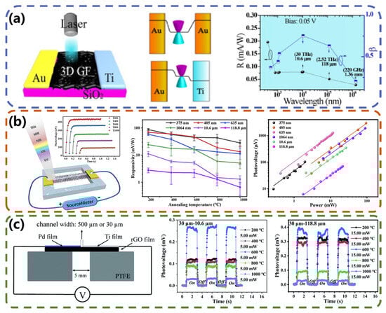 Compared to supported graphene-based photodetectors, suspended graphene-based photodetectors have higher photoelectric conversion efficiency, ultra-low 1/f noise, and lower surface plasmon loss. Therefore, the application of multilayer and suspended graphene films in photodetectors has attracted great interest. Wen et al. [] used freestanding reduced graphene oxide (rGO) films annealed at different temperatures (200–1000 °C) to prepare photodetectors for the first time. The device structure and experimental results are plotted in Figure 4b. The results show that the responsivity of the rGO-based photodetectors decreases by 50% as the annealing temperature increases over an ultrawideband from the ultraviolet (375 nm) to terahertz (118.8 μm) region. This is because the content of electron-donating groups decreases with increasing annealing temperature, which leads to a decrease in the device’s responsivity. Additionally, the device is self-powered and has a response time of <50 ms. Later, Hu et al. [], from the same group, considered the problem of the ohmic contact between rGO films and electrodes. Metals with high and low figures of merit need to be selected to achieve good p-type doping and n-type doping of rGO films, respectively. At the same time, the selected metals need to exhibit good wettability with rGO and remain stable in atmospheric conditions. They chose palladium and titanium metals to achieve good p-type doping and n-type doping of the films by evaporating palladium and titanium films, respectively. Self-powered suspended Pd-reduced graphene oxide-Ti (Pd-rGO-Ti) photodetectors (Figure 4c) were finally prepared, and the properties of the rGO films were varied by using different annealing temperatures. The resulting detectors exhibited an excellent photoelectric response over a broadband illumination wavelength range of 375 nm to 118.8 μm (2.52 THz).
