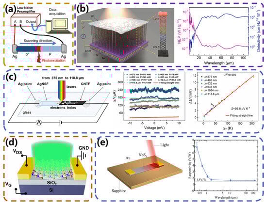 CNT and other two−dimensional materials−based PTE−type broadband photodetectors. (a) Schematic of CNT fiber optic photodetector measurement. Reproduced with permission from ref. [], Copyright © 2018 American Physical Society. (b) Schematic of self−powered CNTF photodetector and detectivity as a function of wavelength. Reproduced with permission from ref. [], Copyright © 2019 American Physical Society. (c) Schematic diagram of the heterojunction device and the ΔI–V curves of their radiated by lasers with wavelengths. Reproduced from ref. [] under the Creative Common license CC BY. (d) A 3D schematic of SnSe2−based photodetector. Reproduced with permission from ref. [], Copyright © 2020 IOP Publishing, Ltd. (e) Schematic of NbS3−based detector and the photovoltage responsivities in different wavelengths of the photovoltage at room temperature. Reproduced with permission from ref. [], Copyright © 2020 American Chemical Society.