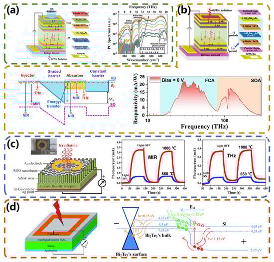 PVE−type broadband photodetectors. (a) The structure of a ratchet photodetector, schematic diagram of infrared/terahertz light response, and broadband response achieved by the detector throughout the entire response range. Reproduced with permission from ref. [], Copyright © 2021 AIP Publishing. (b) Structural diagram of RP−LED upconverter and photocurrent spectrum in the range of 4–20 THz at a specific bias voltage. Reproduced from ref. [] under the Creative Common license CC BY−NC. (c) Schematic of the RGO SiNW array and photocurrent response in the infrared/terahertz band. Reproduced with permission from ref. [], Copyright © 2014 WILEY−VCH Verlag GmbH & Co. KGaA, Weinheim. (d) Bi2Te3−Si heterojunction photodetector and its energy band schematic under reverse source–drain bias. Reproduced with permission from ref. [], Copyright © 2015 Royal Society of Chemistry.