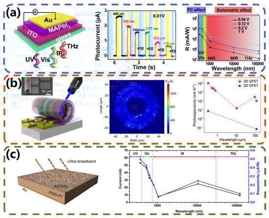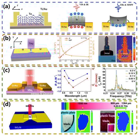 In recent years, the development of superior optoelectronic materials and innovative sensor structures has promoted advancements in both infrared and terahertz detector fields [,,,,,], and some have even been commercialized [,,,,,]. However, the expanding range of wavelengths that need to be detected makes conventional single infrared or terahertz photodetectors inadequate for meeting the demands of increasingly sophisticated optoelectronic sensing [,]. Consequently, there has been a surge of interest in the development of high-performance broadband photodetectors. The Lager Ultraviolet/Optical/Infrared Surveyor (LUVOIR) [] space observatory developed by NASA in the United States will be the first one to detect exoplanets that are the most similar to the Earth; LUVOIR will also seek signs of life within the solar system and beyond. In an international collaboration, China and France are working on a dedicated satellite, Space-Based Multi-Band Astronomical Variable Objects Monitor (SVOM) [,], designed to provide rapid multiband observations of high-energy, transient astronomical events such as gamma-ray bursts (GRBs) and afterglows. Remote sensing researchers in Germany have proposed the multispectral Dynamic Infrared Earth Observation on the ISS Orbit (DIEGO) [] sensor, with 11 spectral bands for narrowing the observational gap between LWIR and MWIR. The data it provides will be instrumental in various fields, including meteorology, climatology, and environmental science. In addition to the above applications, SiGe-based broadband visible–NIR imagers have provided low-cost solutions for a wide range of military applications such as day–night vision, biochemical threat detection, muzzle flash detection, and more []. The U.S. Air Force Office of Scientific Research has helped researchers develop dynamic multiband image datasets for image fusion in military and civilian short-range surveillance scenarios []. The infrared to terahertz spectral range, from a few micrometers to several hundred micrometers, is a key region for bridging the gap between conventional infrared and microwave technologies. The realization of high-performance infrared to terahertz broadband photodetectors would not only enhance established applications in astronomy and military technology, but also unlock novel opportunities for applications such as optical communications, spectroscopy, medical imaging, environmental monitoring, etc., providing insights into previously inaccessible material properties, chemical compositions, and biological phenomena [,,,]. Researchers have conducted reviews on the progress of photodetectors related to infrared and terahertz topics. However, these reviews either exclusively summarized broadband detectors based on single-type materials (e.g., two-dimensional materials) [] or focused solely on research advancements in infrared or terahertz wavelength, which cannot work in both bands []. There is a lack of reviews covering various types of photodetectors operating across the infrared to terahertz regions.