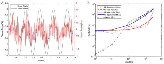 Subsequently, we assessed the viscoelasticity of the sample via oscillatory shear tests. This entailed exerting sinusoidal shear strain at an oscillation frequency () and maximum strain () onto the upper plate. When the strain was controlled within a narrow range, the stress response curve () over time t resembled a sinusoidal curve, mirroring the applied sinusoidal strain’s frequency.