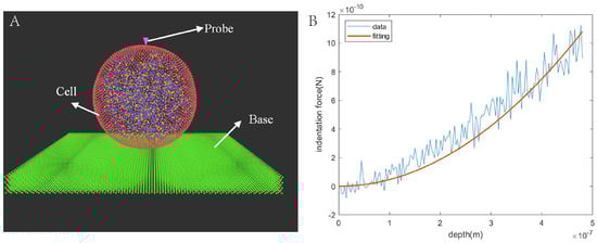 An indentation model was devised within the DPD environment to investigate the mechanical attributes of the cell model, encompassing its two components. In this model, both the substrate and probe were constituted of DPD particles. Given that the probe’s stiffness exceeded that of the samples being measured, the simulation established the probe as a rigid body. Initially, the substrate was immobilized in its starting position, and the cell was positioned atop the substrate, permitting the cell to achieve complete relaxation. Simultaneously, a conical indenter was situated above the cell, inclined at an angle of 18°. Once the cell reached a fully relaxed state, constant speed was imparted to the probe, causing it to approach the cell. As the probe made contact with the cell, deformation ensued. Our recordings captured both the displacement of the probe and the load at the probe’s center of mass, forming the basis for a force–indentation curve. It is essential to note that the probe’s displacement was regarded as akin to the displacement of the piezoelectric scanner in the actual experimental setup. Adjustments were made to the membrane parameters, including the shear modulus (), the bending stiffness (), and the maximum length (). These adjustments aimed to explore their respective impacts on the force–indentation curves.