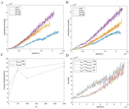 Change in the elastic properties of cells under different membrane parameters. Force–indentation curves for different values of = 5, 50, 100, or 300 and (A) or (B). (C) The relationship between Young’s modulus and for = 65 or 100. (D) Force–indentation curves for different values of and .