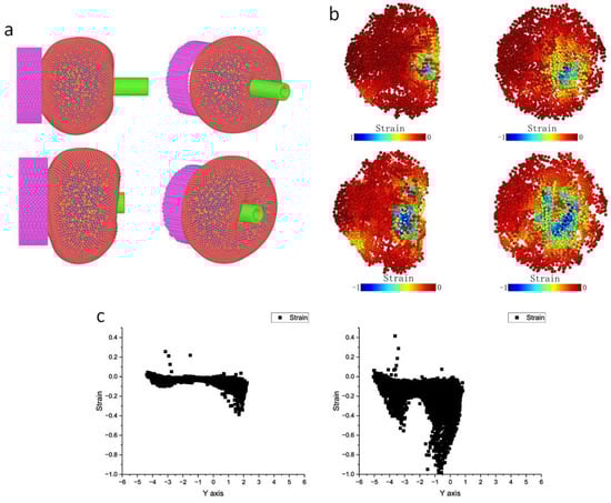 Microinjection experiment simulation. (a) Two stages (initiation of microinjection (upper) and some time later (below)) of microinjection. (b) Strain heatmaps of the two stages. (c) Magnitude distribution of strain in microinjection direction.