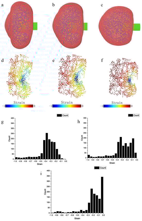 At the start of the simulation, the cell experienced deformation caused by a force field simulating negative pressure, resulting in a section of the cell being drawn into the aspiration micropipette, as depicted in Figure 5a. Once the aspiration stabilized, the microinjection micropipette commenced its movement toward the cell. Gradually, as the micropipette penetrated to a shallow depth, the entire cell underwent compression along the micropipette’s direction of movement. Continuing penetration led to substantial local deformation at the interaction point with the micropipette. Notably, the membrane in this area experienced noticeable stretching. As the micropipette reached a specific depth, the membrane bonds surpassed their designated length, resulting in the rupture of the cell membrane. We isolated the cytoskeleton component and specifically analyzed its strain during microinjection, as depicted in Figure 5b. Two image sets illustrate the strain magnitude at various penetration depths. The initial set of images portrays the cytoskeleton’s deformation at a shallow penetration depth, while the subsequent set illustrates deformation during deeper micropipette penetration. The regions of deformation, indicated by higher strain in blue, were primarily concentrated around the microinjection site. With increased penetration depth, the strain consistently increased, and the extent of deformation also increased progressively (Figure 5c).