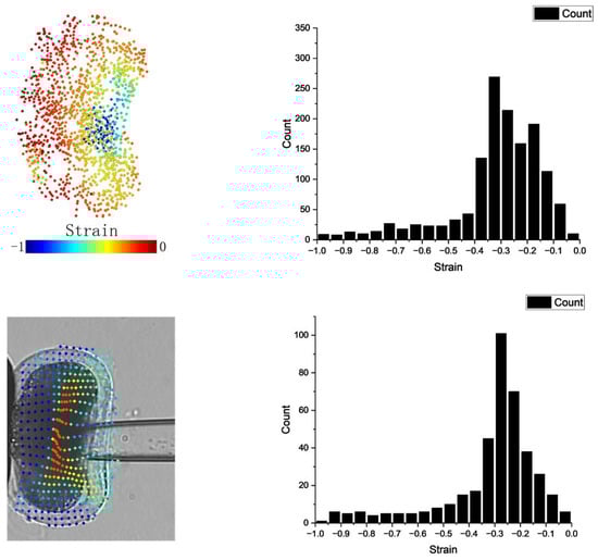 It is important to note differences in strain calculation methods between the simulation and the actual experiment. In the simulation, strain was directly computed from a three-dimensional point cloud, whereas in the experiment, strain was derived from two-dimensional images. Additionally, the simulation randomly selected cytoskeleton particles for strain calculation, while in the images, the selected feature points were uniformly distributed (by using optical flow estimation). Within the three-dimensional point cloud, we opted for the cross-section near the cell’s center and projected the points onto a two-dimensional plane to compute strain in the penetration direction (Figure 7). To compare simulation and experimental results for cells penetrated at a speed of 10 μm/s, we utilized a histogram as a metric. By comparing the strain distributions, we observed a prominent peak in the low-strain region within the range of [−0.4, −0.2]. Upon plotting the strain histogram, we used the metrics Jaccard similarity coefficient, Bhattacharyya distance, and JS divergence to gauge similarity between simulation and experimental distributions. The Jaccard similarity coefficient yielded a value of 0.655, while Bhattacharyya distance and JS divergence were 0.0272 and 0.0267, respectively. These values suggest that our model effectively captured deformation patterns akin to those observed in the experiments.