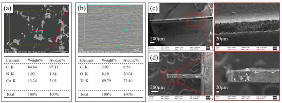 Figure 1 shows the EDS results of PCD and TA2 samples. In Figure 1a, the main elements in PCD are carbon (C) and cobalt (Co), where C primarily represents diamond particles, and Co serves as the binder. Figure 1b illustrates the elemental content on the surface of TA2. The tool electrode chosen for this experiment is W70Cu30 tungsten–copper alloy. Figure 1c,d shows that the tool electrode. The electrode tips have been wire-cut to fabricate the sheet tool electrode with the thickness of 100 μm.