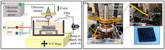 Experimental setup: (a) schematic diagram; (b) die-sinking micro-EDM setup and samples.