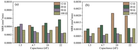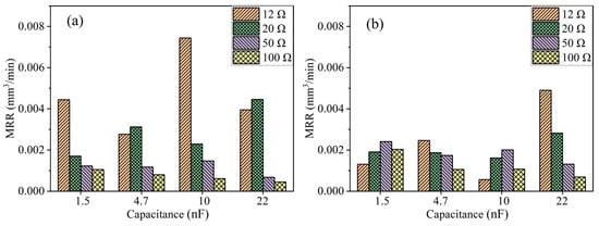 The maximum MRR occurs with the combination of a capacitance of 22 nF and a discharge resistance of 20 Ω. For die-sinking micro-EDM, the discharge current significantly influences the MRR. At the largest capacitance, an increase in the discharge resistance leads to a decrease in the MRR. However, at a lower capacitance, such as 1.5 nF, the maximum MRR occurs at a discharge resistance of 50 Ω. The capacitance and the discharge resistance determine the maximum value of the single discharge energy and the feeding rate of the tool electrode.