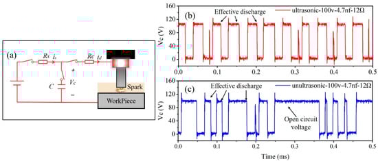 Figure 4a shows the schematic diagram of the RC power supply topology. Figure 4b,c represents the voltage waveform across the capacitor obtained under the discharge parameters of an open-circuit voltage of 100 V, a capacitance of 4.7 nF and a discharge resistance (RC) of 12 Ω. The waveform without ultrasonic vibration exhibits more open-circuit phenomena, with unstable time intervals between each pulse discharge and significantly fewer discharges per unit time compared to the counterpart with ultrasonic vibration.