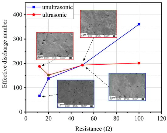 As shown in Figure 9d, the average effective discharge counts and SEM images of ultrasonic vibration-assisted die-sinking micro-EDM of TA2 under different discharge resistances with an open-circuit voltage of 100 V and a capacitance of 10 nF are presented. The effective discharge counts in processing TA2 are positively correlated with discharge current, indicating that the cavitation effect has limited impact on breaking the arc. The smaller the discharge current, the easier it is to break the arc, returning the machining process to a normal discharge state. As seen in the SEM images, at a discharge resistance of 12 Ω, the machined bottom surface of TA2 exhibits sheet-like craters caused by arc discharge. Arc discharges lead to melting the surrounding workpiece at high temperatures, resulting in large areas of recast layer. With an increase in the discharge resistance, the sheet-like area on the machined surface becomes smaller. At a discharge resistance of 100 Ω, the average effective discharge count is 220, and the diameters of individual discharge craters are mostly below 10 μm. These results indicate that the cavitation effect on breaking the arc is influenced by the discharge resistance during processing of TA2. As the resistance increases and the current decreases, the effect of ultrasonic vibration on breaking the arc enhances, thereby affecting the effective discharge counts and surface quality.