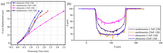 In Figure 7a, the z-axis displacement trajectories under the machining parameters of an open-circuit voltage of 200 V, a capacitance of 22 nF and a discharge resistances of 12 Ω are presented. In the initial stages, the trajectories with and without ultrasonic vibration are almost identical. As the inter-electrode state gradually stabilizes, the machining speed increases. After reaching 25 μm, differences begin to emerge, as is the case with ultrasonic vibration maintaining its speed. On the contrary, in the case without ultrasonic vibration, the feeding rate starts to slow down. By the time the travel distance reaches 75 μm, the feeding rate of the case with ultrasonic vibration also begins to decelerate, but the machining efficiency remains significantly higher than that without ultrasonic vibration. The machining profiles with and without ultrasonic vibration -assistance at this energy level are shown in Figure 7b, where the machining depth and groove width are essentially the same, indicating that ultrasonic vibration has little impact on tool wear under these energy parameters and improves machining efficiency. As the machining depth grows, the cavitation effect becomes more pronounced.