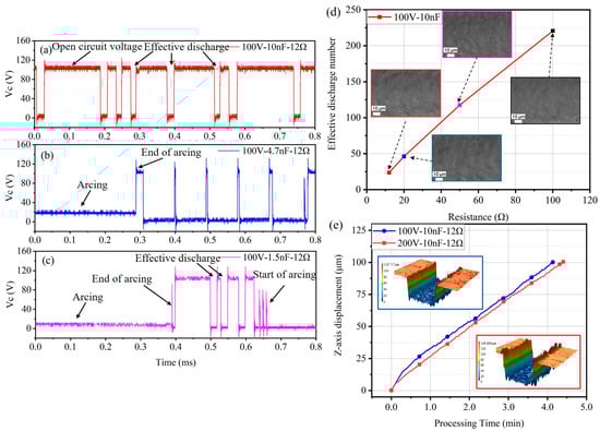 Discharge waveforms at different capacitance amounts: (a) 10 nF; (b) 4.7 nF; (c) 1.5 nF; (d) average effective discharge counts and SEM images at an open-circuit voltage of 100 V and a capacitance of 10 nF; (e) trajectories during ultrasonic vibration-assisted die-sinking micro-EDM of TA2.