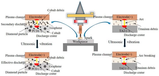As mentioned earlier, PCD and titanium alloys demonstrate low efficiency in EDM due to their unique material characteristics [22]. Many research findings [23,24,25,26] indicated that ultrasonic vibration induced a stirring effect and cavitation, aiding in debris removal and preventing material deposition on machined surfaces. The introduction of ultrasonic vibration significantly influenced the MRR, tool wear rate and taper angle of titanium alloy workpieces [27]. Wang et al. [28] induced vibrations in workpieces and effectively improved the efficiency of machining micro-deep holes in hard materials. M. Goiogana et al. [29] indicated that ultrasonic vibration-assisted processing in pulse mode can effectively improve surface roughness and uniformity. Employing ultrasonic vibration on electrodes also can significantly enhance processing efficiency [30]. B. Jabbaripour et al.’s research [31] on machining titanium alloy materials indicated that power supply parameters had an impact on the MRR and surface quality of titanium alloy materials. Therefore, in practical applications, appropriate adjustments and optimization are necessary to determine the optimal ultrasonic amplitude to achieve the best performance [32].